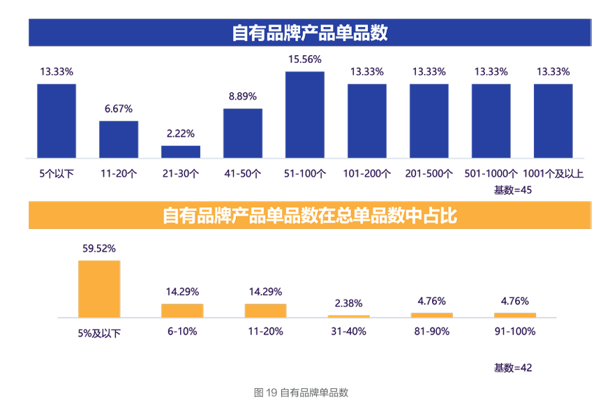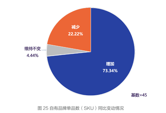 自有品牌单品数(SKU)同比情况以增加为主(占比 73.34%),有 22.22% 的零售商同比减少了自有品牌 SKU。