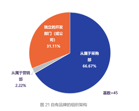 自有品牌的组织架构以从属于采购部为主(占比 66.67%),其次是独立的开发部门(或公司),占比 31.11%。