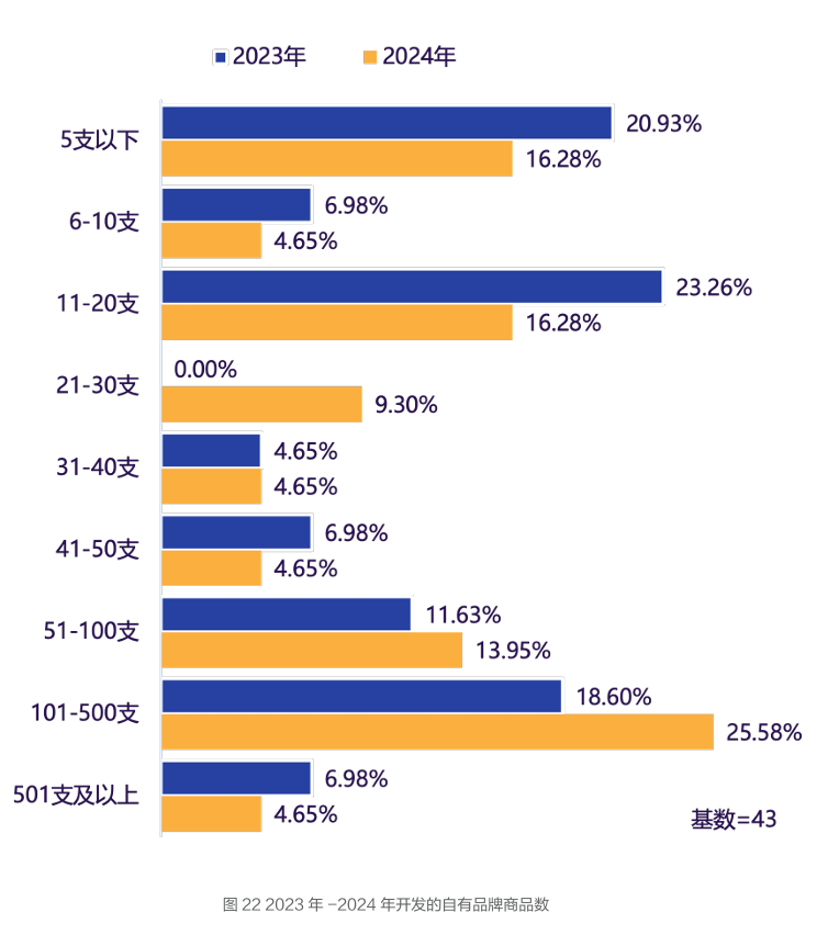 2023 年开发的自有品牌商品数均值为 117.44 支。从结构分布看,5 支以下、11-20 支占比最高,其次是 101-500 支,占比达到 18.60%。2024 年开发的自有品牌商品数均值为 123.05 支。从结构分布看,101-500 支占比最高,其次是 5支以下、11-20 支、51-100 支。
