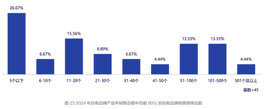 在 2024 年自有品牌产品年销售总额中,平均 96.33 个单品贡献 80% 的自有品牌销售额。从结构分布看,5 个及以下占比最高(26.67%),11-20 个、51-100 个、101-500 个占比也较高。