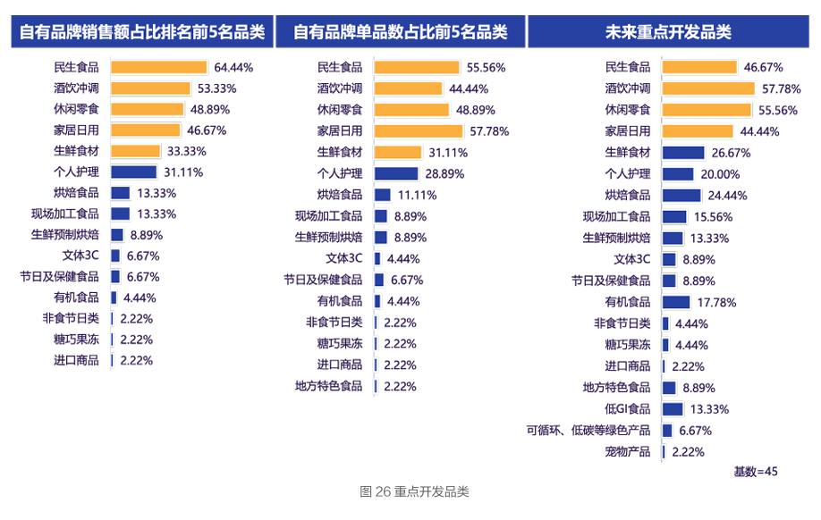 民生食品、酒饮冲调、休闲零食、家居日用、生鲜食材是自有品牌销售额占比排名前 5 名的品类,家居日用、民生食品、休闲零食、酒饮冲调、生鲜食材是自有品牌单品数占比前 5 名的品类,民生食品、酒饮冲调、休闲零食、家居日用是未来将重点开发的品类。