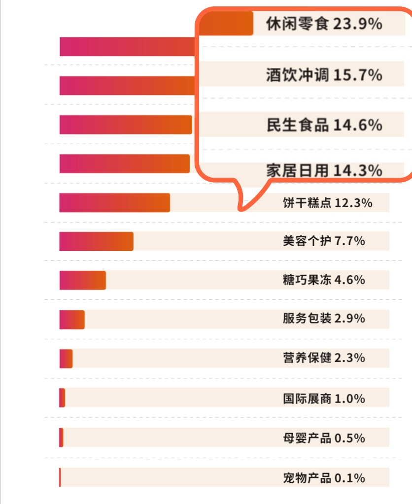 粮油副食、生活用纸、饮料、酒、蛋品是单品销售额最高的前五个品项。