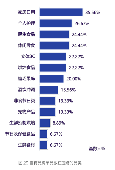 自有品牌单品数在压缩的品类主要是家居日用、个人护理、民生食品、休闲零食、文体 3C、烘焙食品、糖巧果冻